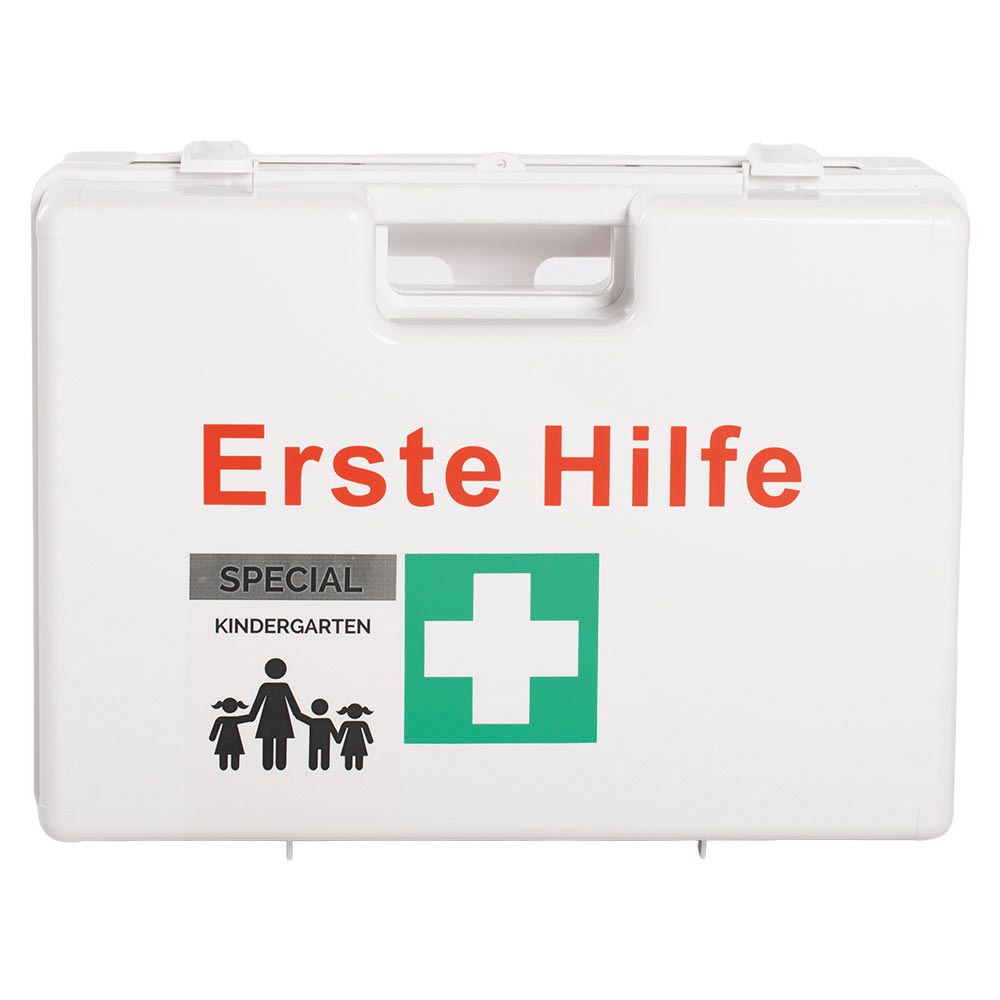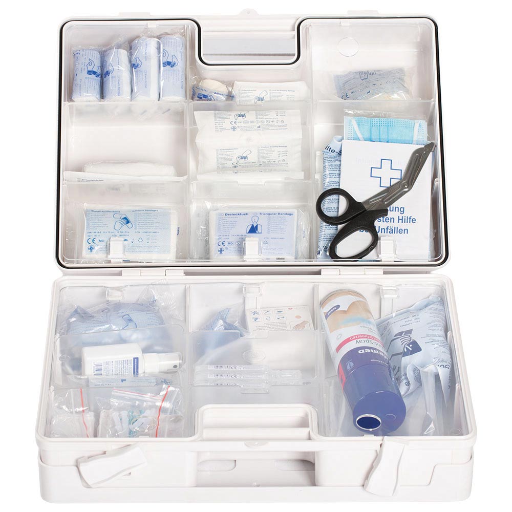 Erste Hilfe-Koffer inkl. der gesetzlich vorgegebenen Verbandsstofffüllung. Schnell zur Hand für den stationären oder mobilen Einsatz.