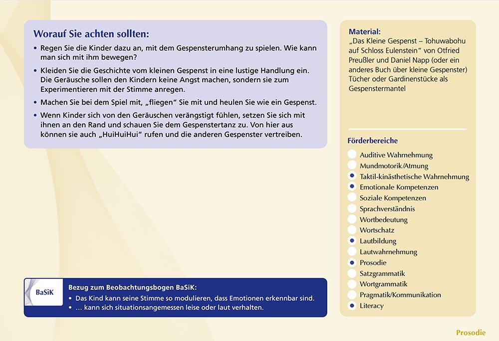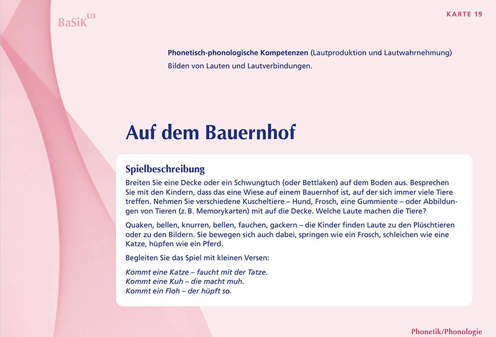 Die vorliegende Spielesammlunge ist konzipiert für die Praxis der Sprachbildung und Sprachförderung. Nach einer kurzen Beschreibung des jeweiligen Förderbereichs wird eine der 40 Spielideen erläutert. Es folgen Anregungen und Tipps, worauf bei der Umsetzung zu achten ist: Wie wir die Interessen der Kinder berücksichtigen und uns „sprachförderlich" verhalten. Abschließend wird jeweils der Bezug zu dem Beobachtungsbogen BaSiK hergestellt. Die Karteikarten verstehen sich als Impulse, sie geben Beispiele für Fördermöglichkeiten.