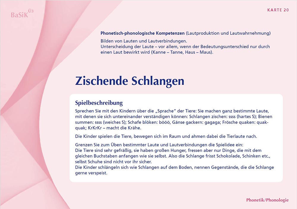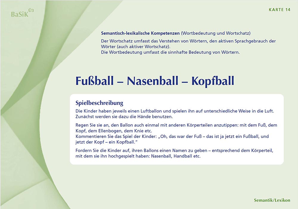 Das Kartenset zu BaSiK Ü3 ist die ideale Ergänzung zu dem Beobachtungsverfahren BaSiK. Zu den Basiskompetenzen und zu den Sprachbereichen sind jeweils mehrere Praxisbeispiele angegeben, die einerseits zur Beobachtung eingesetzt werden können, andererseits aber auch zur Förderung der sprachlichen Kompetenzen der Kinder dienen. Die Spielideen machen Lust zum Mitmachen. Hinweise zum sprachförderlichen Verhalten der pädagogischen Fachkraft runden die Spielideen ab. Ganz konkret wird bei den Spielvorschlägen der Bezug zum Beobachtungsbogen hergestellt.