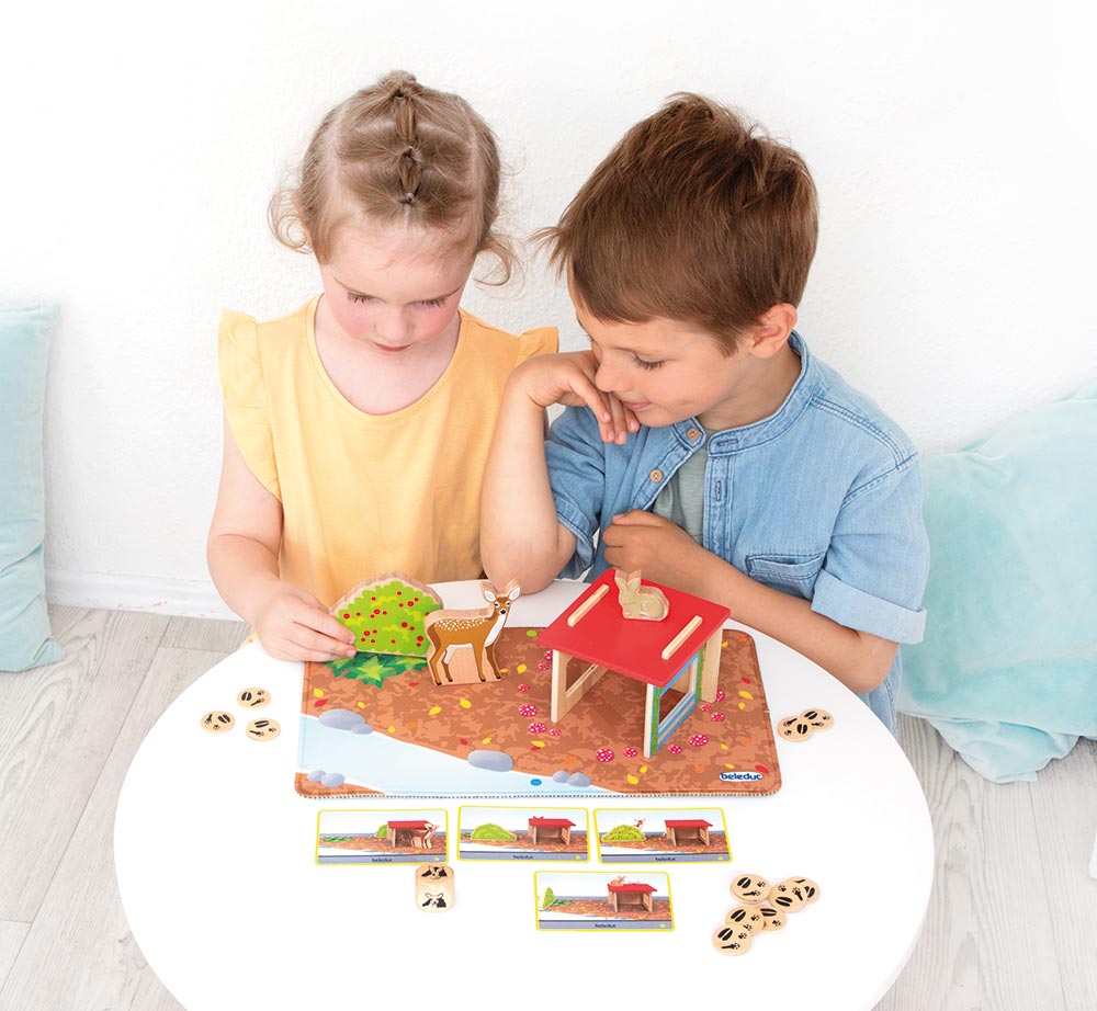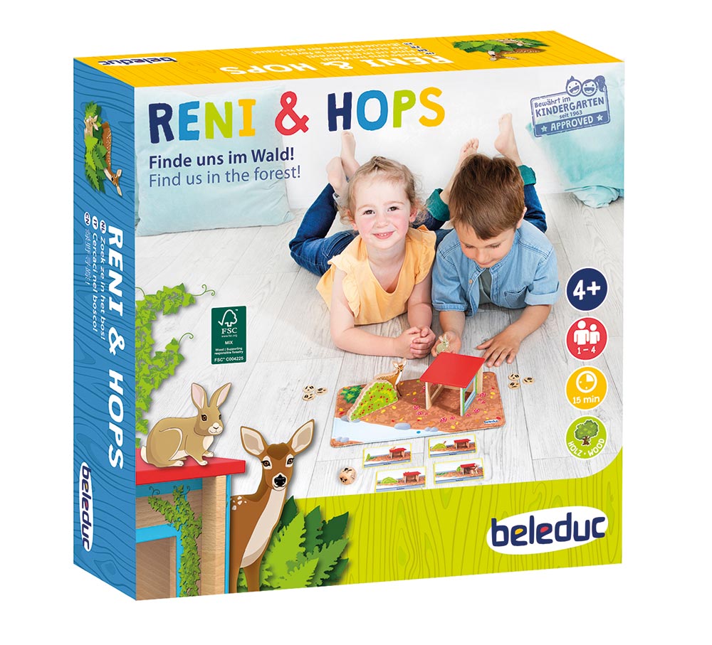 Bei diesem Spiel ist eine gute Beobachtungsgabe gefragt. Findest du die Tiere, die es sich auf der Lichtung im Wald gemütlich gemacht haben? Beschreibe das Versteck von Reh Reni und Hase Hops, baue es mithilfe von Haus und Busch nach und gewinne Tier-Taler. Zur Förderung der räumlichen Wahrnehmung, der Merkfähigkeit und sprachlichen Beschreibung.
