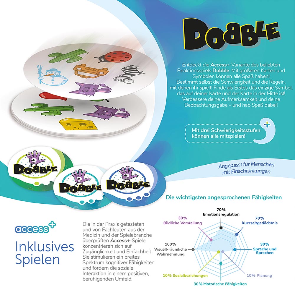 Die Access+-Variante des des Bestsellers DOBBLE, angepasst für Menschen mit kognitiven Einschränkungen. Extra große Karten sorgen für eine bessere Sichtbarkeit der Symbol und dank drei verschiedenen Schwierigkeitsstufen können alle mitspielen!