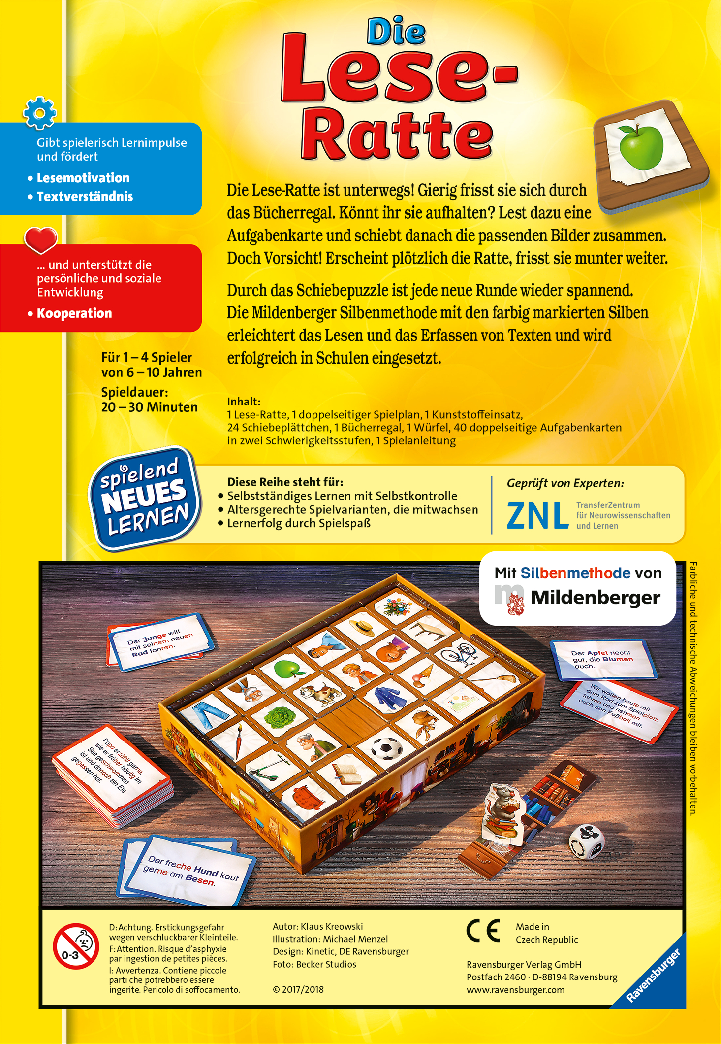 Beim Wettlauf mit der Lese-Ratte tauchen Kinder tief in die Welt der Buchstaben, Wörter und ihrer Aussprache ein. Damit ist das Spiel eine willkommene Ergänzung zum schulischen Lernen oder die ideale Vorbereitung darauf. Seinen großen pädagogischen Wert erhält es aus der Anwendung der vielfach bewährten Mildenberger Silbenmethode. Lernspiele, die richtig Spaß machen: So heißt das Motto der Lernspielreihe von Ravensburger, mit der Kinder in den lernintensivsten Jahren in ihrer Entwicklung unterstützt werden. Alle Spiele werden nach neuesten wissenschaftlichen und pädagogischen Standards entwickelt und geprüft. Die Lernstoffe sind in spannenden Geschichten verpackt, eine Vielfalt an Materialien und Methoden erlaubt das Lernen mit allen Sinnen.