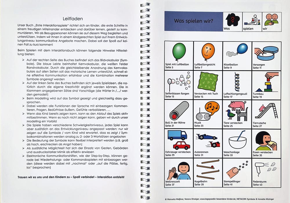 Das Interaktionsbuch richtet sich an Kinder, die erste Schritte in einem freudigen Miteinander entdecken und darüber lernen, gezielt zu kommunizieren. Mit 20 Spielideen und METACOM-Symbolen von ©Annette Kitzinger.