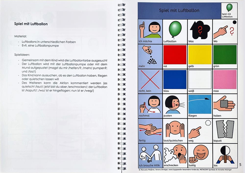 Auf der rechten Seite des Buches befindet sich das Bildvokabular (Symbole). Die blaue Leiste beinhaltet Kernvokabular, die weißen Felder Randvokabular. Durch die gleichbleibende Anordnung des Kernvokabulars auf allen Seiten soll das motorische Lernen unterstützt, schnell eine effektive Kommunikation erfahrbar und die Kombination mehrerer Symbole angeregt werden. Auf der linken Seite des Buches befinden sich jeweils Spielideen, die natürlich durch die eigene Kreativität ergänzt werden können.
