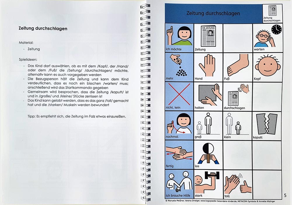 Auf der rechten Seite des Buches befindet sich das Bildvokabular (Symbole). Die blaue Leiste beinhaltet Kernvokabular, die weißen Felder Randvokabular. Durch die gleichbleibende Anordnung des Kernvokabulars auf allen Seiten soll das motorische Lernen unterstützt, schnell eine effektive Kommunikation erfahrbar und die Kombination mehrerer Symbole angeregt werden. Auf der linken Seite des Buches befinden sich jeweils Spielideen, die natürlich durch die eigene Kreativität ergänzt werden können.